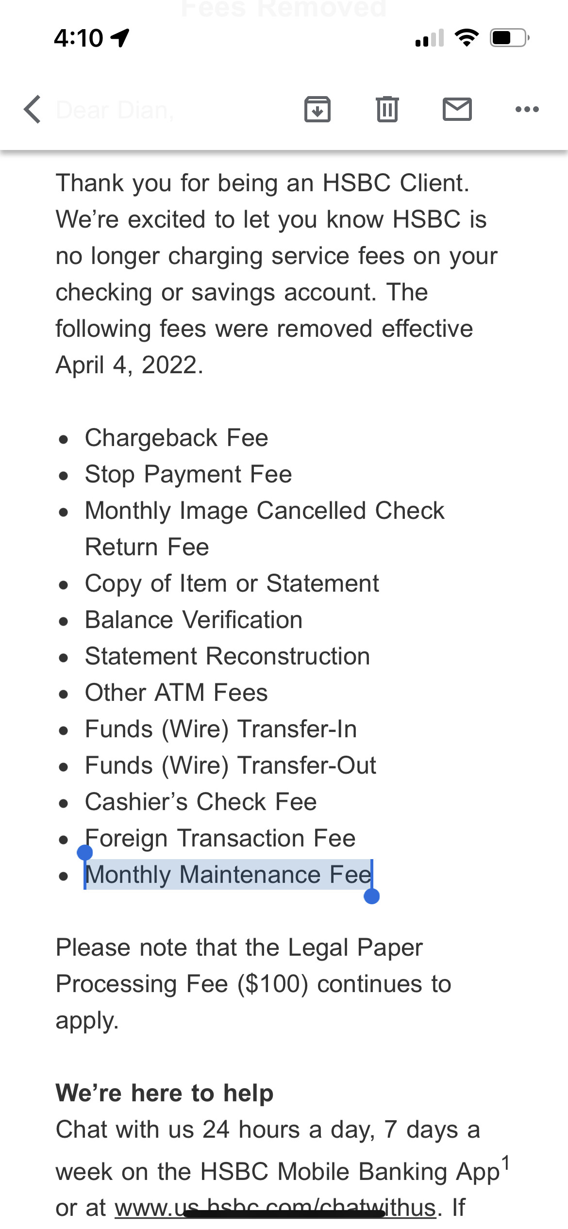 刚收到 HSBC 的邮件,说是 “Checking and Savings Service Fees Removed”,其中包括 “Monthly Maintenance Fee”。是不是说以后每月没有 $5000 的 DD 也不用交 $50 了?不过如果不搞 $5000 的 DD 了,Premier 的状态还能维持吗?如果能维持,岂不是已经上车的人就有了永久且免费的 Premier 身份……