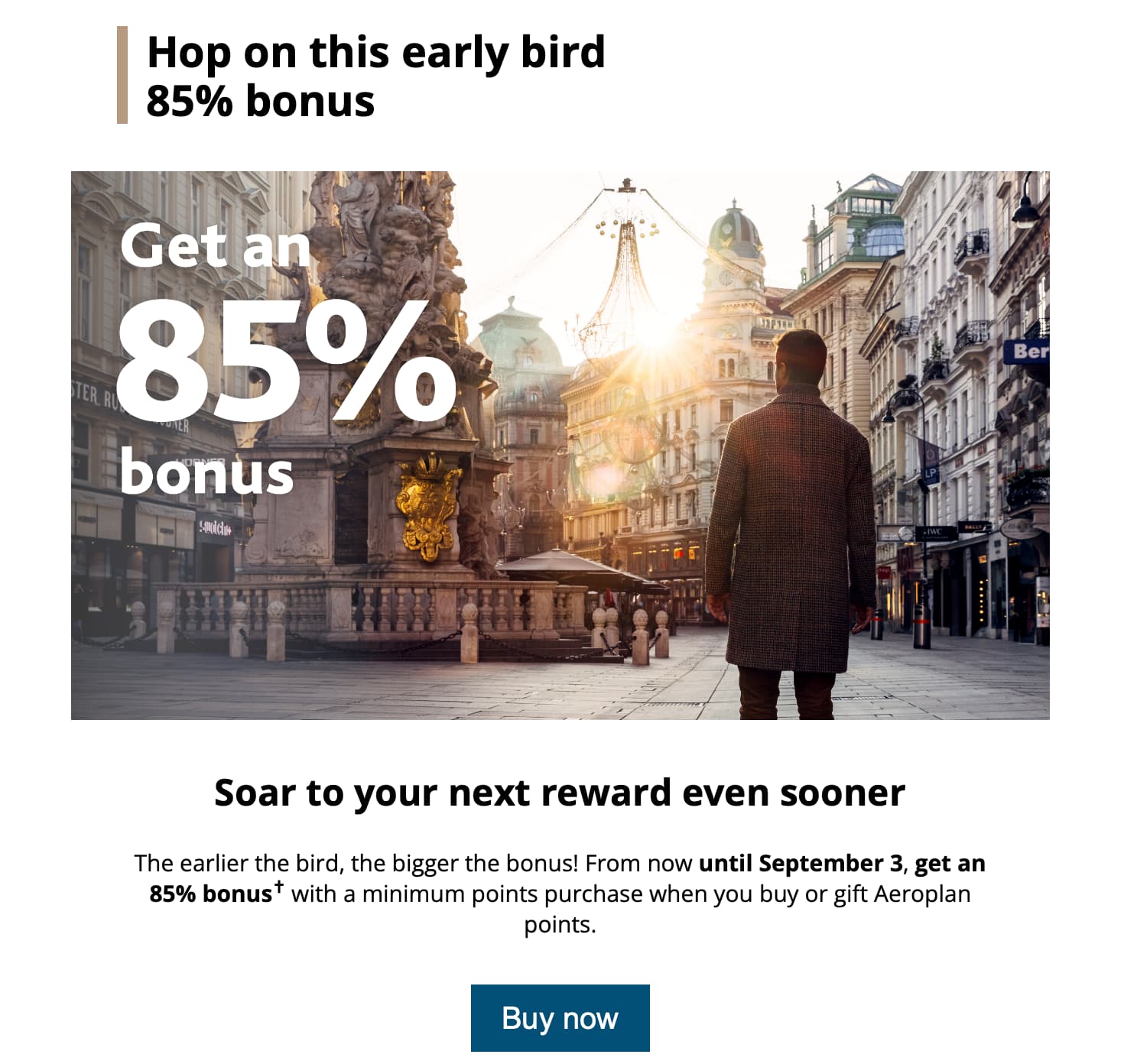 From now until September 3 , get an 85% bonus† with a minimum points purchase when you buy or gift Aeroplan points.