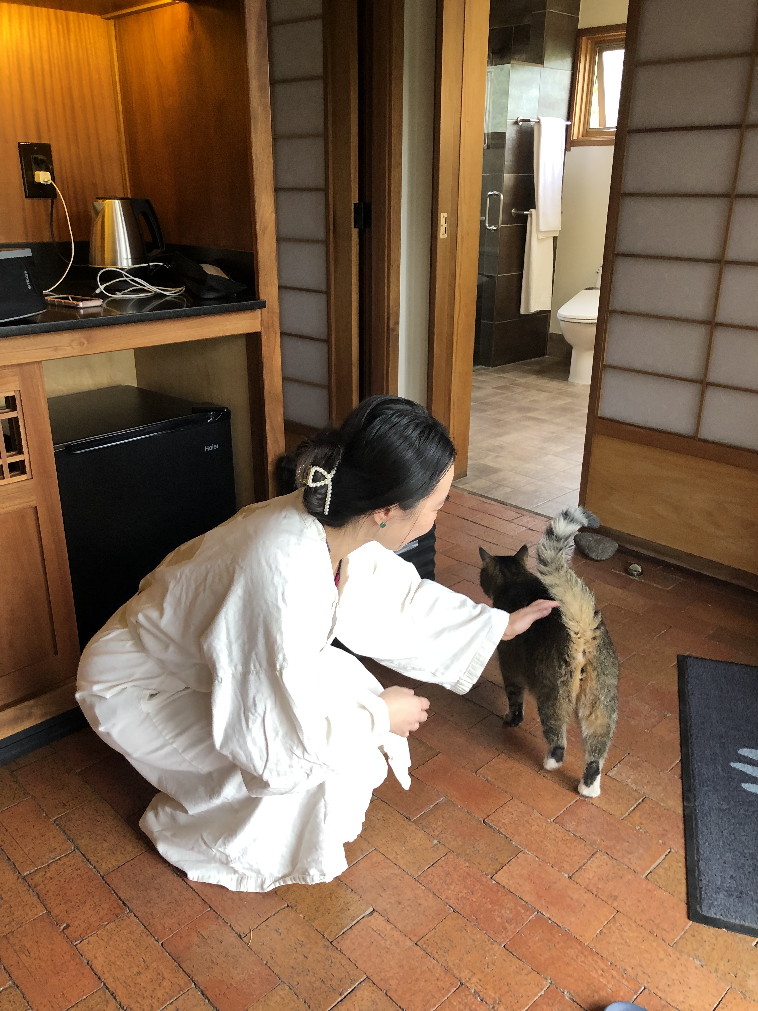 不过谁让这就是NM的state road/county road呢。。。。。。。。。以及谢谢Jeep。。。当晚入住Hyatt Place Santa Fe,8000分换的性价比很高,酒店服务没的说,Discoverist居然送了水和零食!!!零食这个真的没想到,但是大槽点是床太软了,我睡不惯,睡了一晚上沙发。。。。。。。 - Day 5 - 6/16周四:当天住1晚万波,知道万波早饭量小,早上特意从Hyatt Place揣了俩bagel,太明智了!10am的Meow Wolf,好玩是好玩,我们也算挺爱玩一般不走马观花的人了,但依然一个多小时就玩完了,并没有很多人建议的2~3小时。中午就吃了Meow Wolf门口的餐车,离万波4pm的check-in还早,虽然当天9am开始就能去用设施,但是实在不想去躺尸(spa里有榻榻米房,叫relaxation room吧,以前好像叫meditation room),就去了Museum Hill,我比较感兴趣的是Wheelwright Museum of the American Indian和Museum of Indian Arts & Culture,结果前者网上说$8 admission fee,到了现场一个简陋的牌子说要$10,队友觉得观感不佳,我们就退出了,后者在装修布展,只开了一个展室,看的东西不多,免了门票(但我买买买花了很多。。。),去了万波以后,先去了公汤,不排队也没啥人,等4pm可以回屋时候,喜迎spa cat Avi在我们门口守着,我是cat person,二话不说把猫大爷迎进了门就是一顿薅,简直不舍得去泡私汤。。。出门前痛苦地把猫爷请出了门,不知何时能再见。尼玛结果泡好汤吃好晚饭居然还在我们门口。。。于是又带回房一顿薅。。。本以为可以抱着过夜,但是不羁爱自由的渣猫在撸爽睡爽后还是在风雨中离开了我们。。本来担心6月泡汤会太热,但是万波海拔好像也6000多ft,真的不热,订的5:45pm-7:15pm的,看着晚霞,真的美好极了。然后,虽然住店和泡汤涨价到无比过分,万波的礼品店真的良心!!!好多made in Japan的超可爱碗碟器具,就几块钱一个。。真的好好看好好看好好看。。。要不是怕运输碎了,好想多买几个啊~比起Santa Fe老城的礼品真的是良心啊~