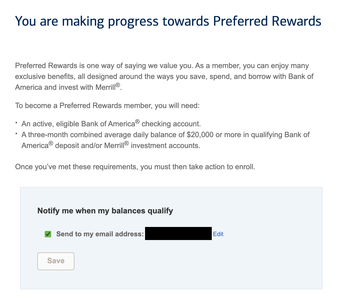 You must have the minimum combined balance of $20,000 in your eligible Bank of America deposit accounts and/or your Merrill® investment accounts within 30 days of opening the checking account. Once you meet the $20,000 balance requirement, you’ll be automatically enrolled in Preferred Rewards.