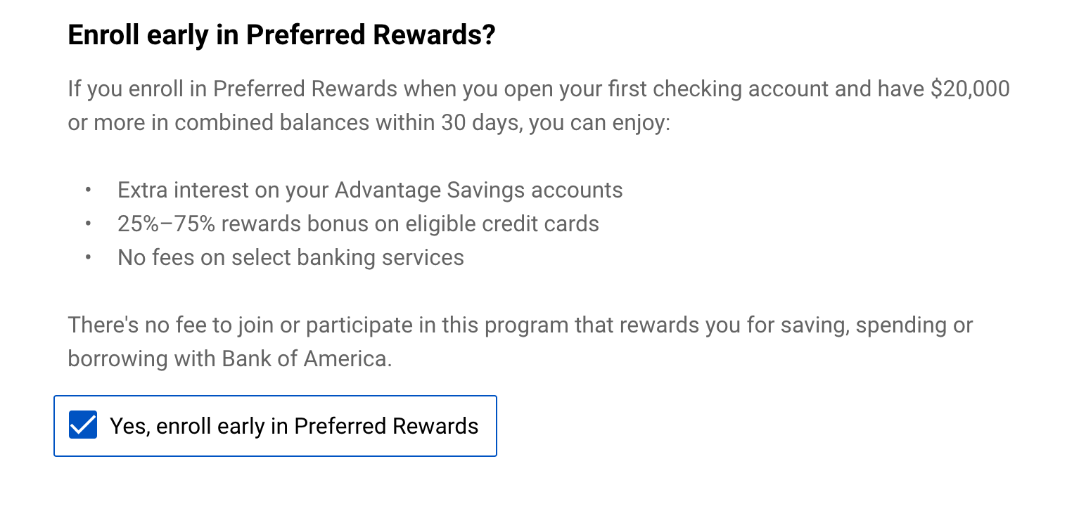 Promotional Early Enrollment in Preferred Rewards: When you enroll in the Preferred Rewards $1000 More Cash Offer, you consent to early enrollment in the Preferred Rewards Program. Once you satisfy the funding requirement for the offer, you will be enrolled in Preferred Rewards within 45 days based on your current balances at that time rather than the usual requirement of three-month average combined balances. You also must have or open an eligible Bank of America personal checking Advantage Banking account to be enrolled in Preferred Rewards. All Preferred Rewards benefits available in the tier associated with your combined balance level will be active within 30 days of enrollment.