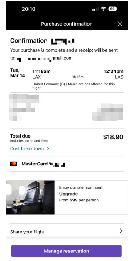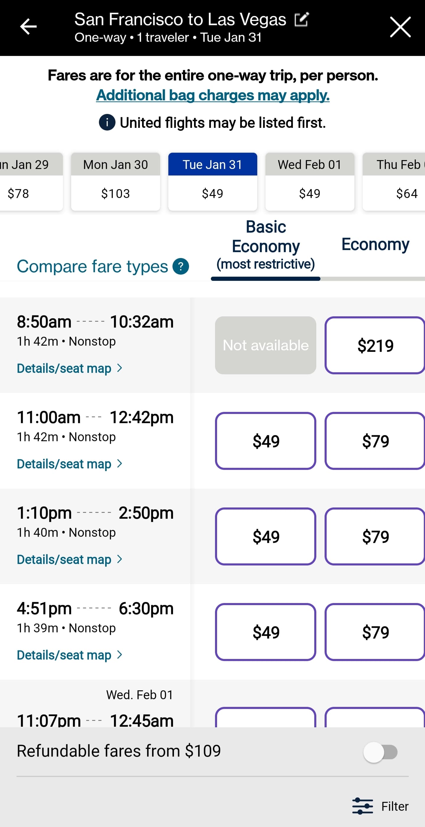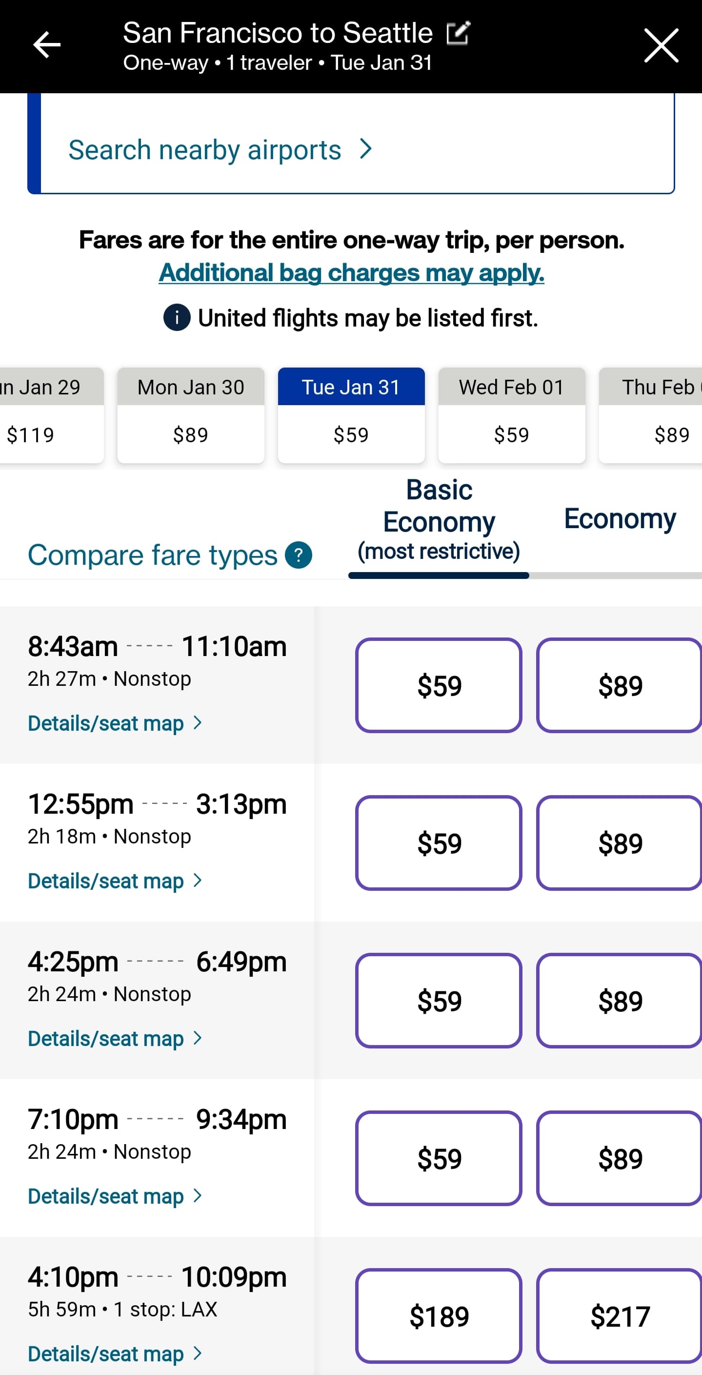 Sfo-sea是59,united里面有个价格地图可以更直观。sfo-las的是49,本来想定这个,但是checkout的时候一直说something went wrong。只能多套$9
