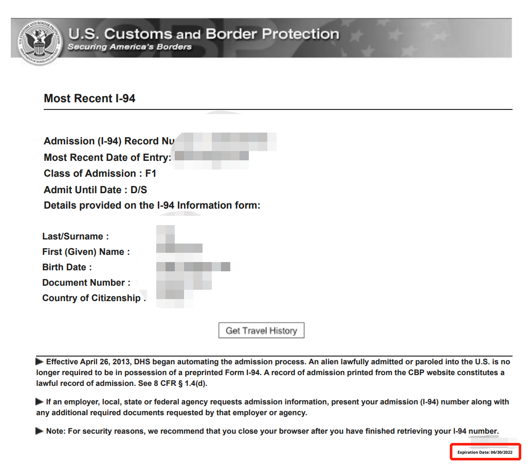 f-1是D/S,但是打印most recent I-94的时候,网站上会有一个expiration date吧?在网站页面的左下角,打印文件的右下角
