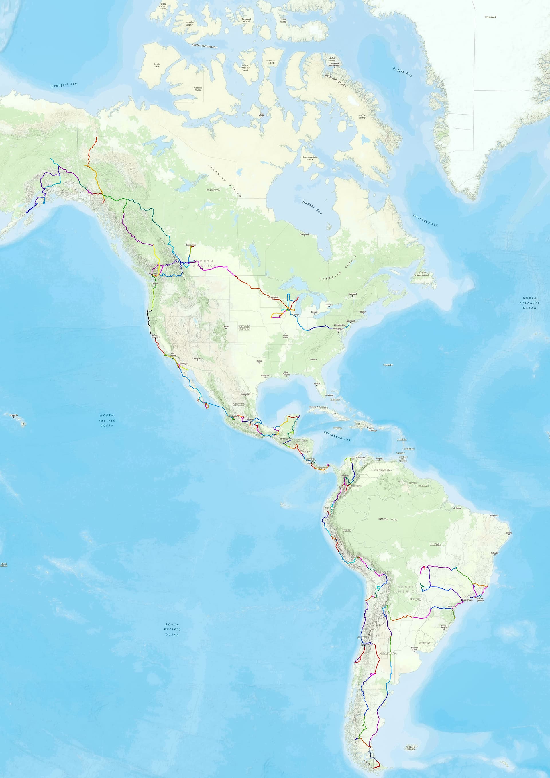 我的整个美洲穿越始于纽约,2021年7月我先开车向西去中西部的威斯康辛州呆了一段时间。8月加拿大放开,一路向西穿过班夫国家公园直奔加拿大北部的育空地区和阿拉斯加。9月从Fairbanks开到温哥华朋友小住,期间正好以温哥华为中心详细走了走BC和AB省的公路。12月一路沿着西海岸的1号公路南下墨西哥,在第二年7月到达泛美公路的终点乌斯怀亚。之后掉头向北又进入了巴西和巴拉圭交界区域。最终在巴西境内穿行了近两个月后从圣保罗飞回美国,画完了这张路线图。