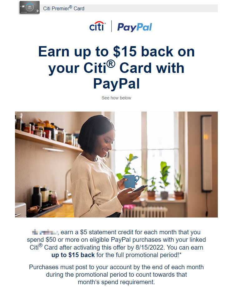 premier: earning 5 Bonus ThankYou® Points per $1 spent - up to 3,000 points total - in addition to what your card normally earns on eligible PayPal purchases with your linked Citi® Card through 9/30/2022.*